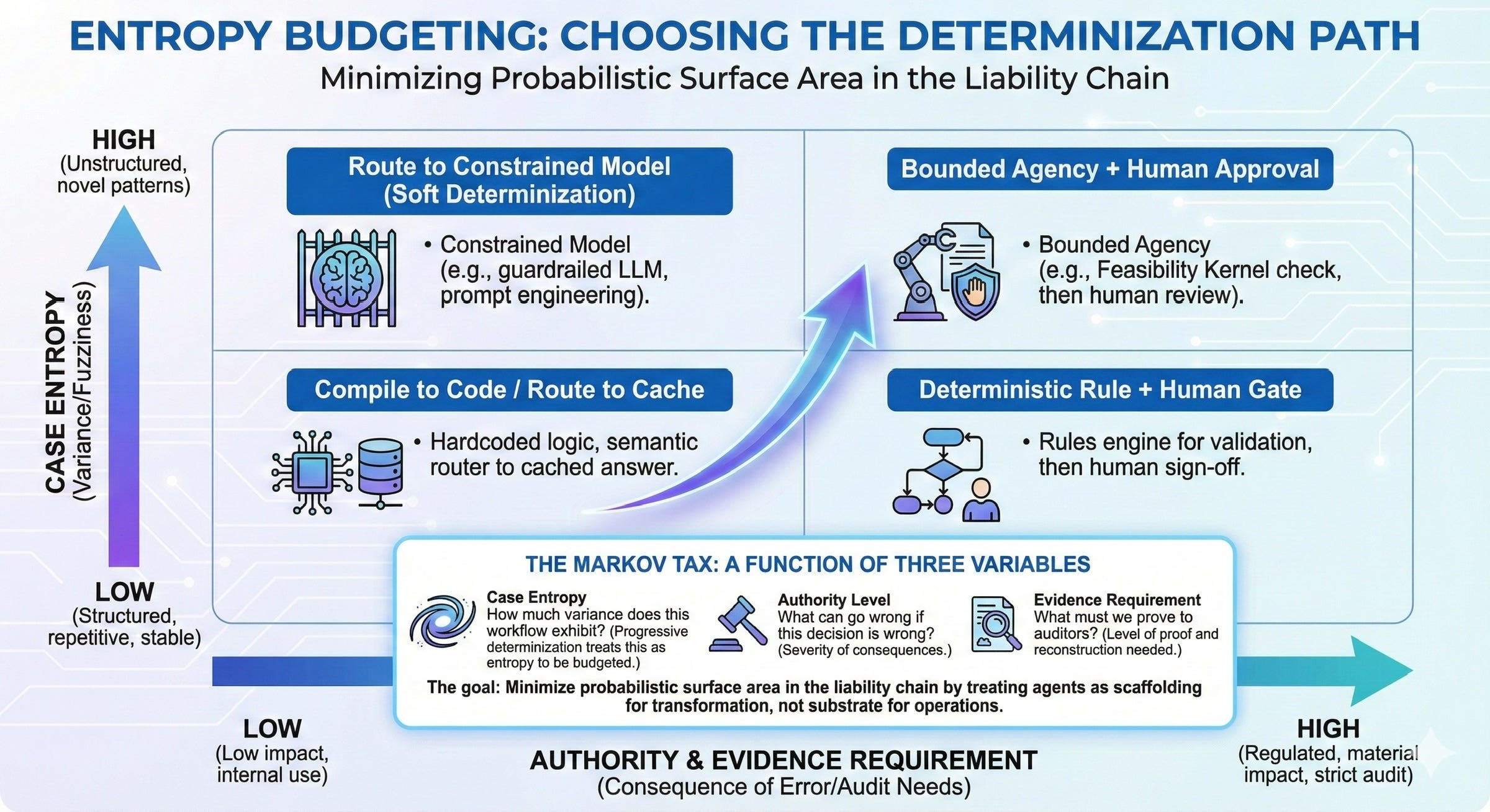 The distinction between soft and hard determinization is not academic. Soft determinization—Constitutional AI, guardrail frameworks, prompt engineering, fine-tuning—constrains the distribution of outputs but the system remains probabilistic. “Very high reliability” is not “certain,” and in domains where residual failures translate to material harm, the difference is a lawsuit. Hard determinization eliminates output variance given identical inputs: deterministic code, SQL, rules engines, semantic routers to cached responses, explicit human decision points. The target for stable patterns is hard determinization. Soft is a waystation, not a destination.