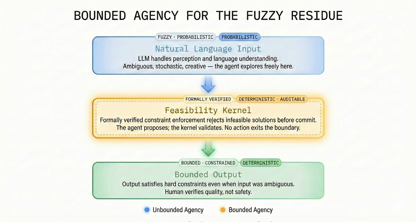 None of these are complete formal proofs across all constraint classes. They don’t need to be. Even at 99% enforcement accuracy, the economics invert: the human verifies the cases where the boundary flags uncertainty—not the totality of output that unbounded agency demands.