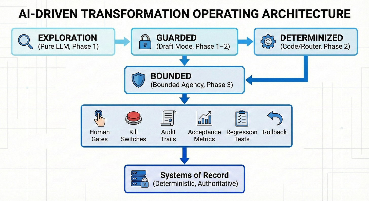 The companies that win will not be the ones that deploy the most agents. They will be the ones that deploy agents strategically — as instruments of discovery that feed determinization and constraint, not as permanent, ungovernable substitutes for process discipline.