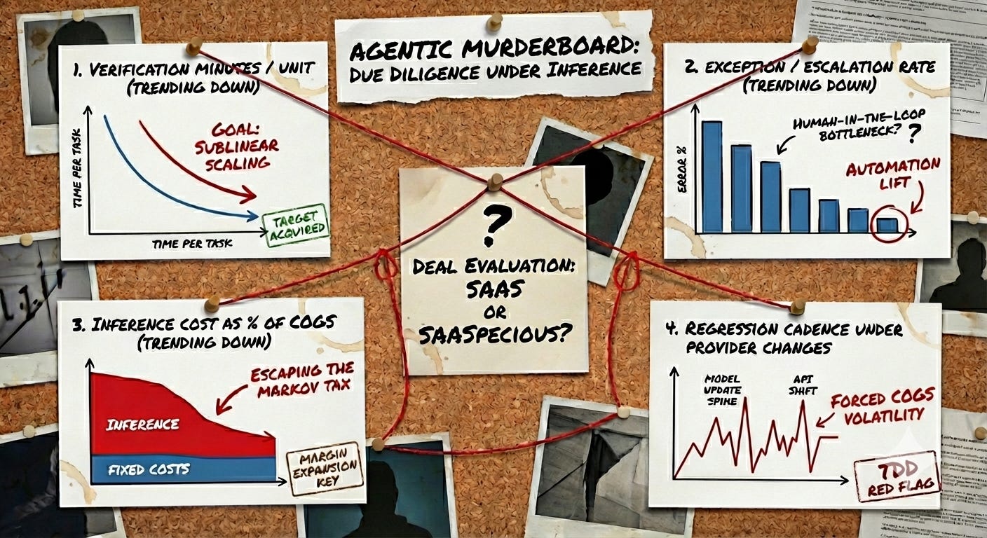 Benchmarkit’s 2025 survey (n=372) found only 15% of companies can forecast AI costs within ±10%. If the margin model collapses under volume doubling, the valuation is pricing a cost structure that does not yet exist. Diligence must demand verification minutes per unit, exception rate, inference cost as a percentage of COGS, and regression cadence under provider changes — all trending down.