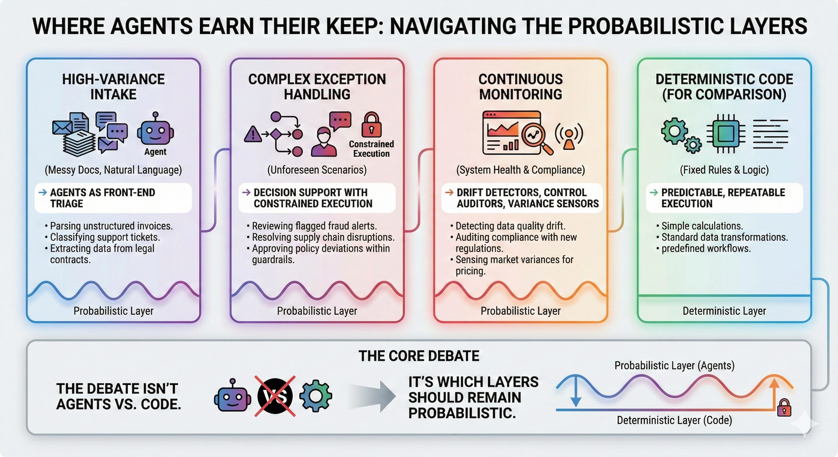 At enterprise scale, agents rarely substitute labor cleanly. They substitute certainty with orchestration.
