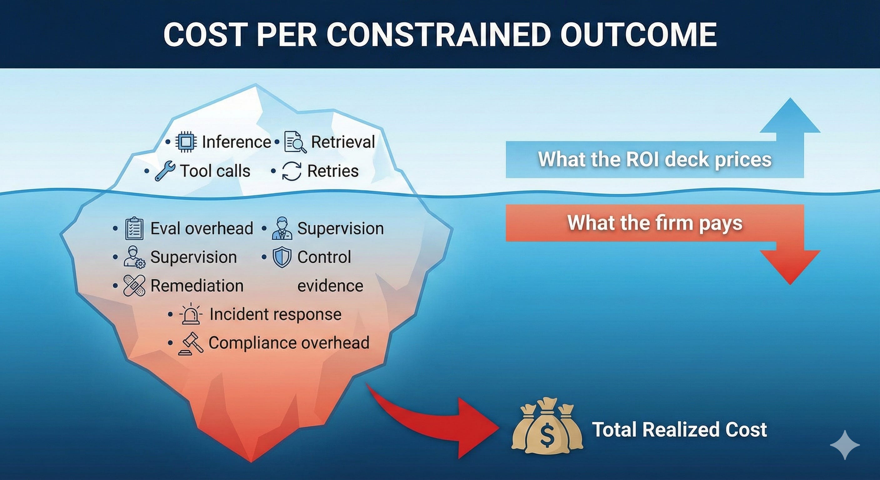 The unit is not “cost per agent-hour.” It is: cost per correct outcome under constraints, including tail risk.