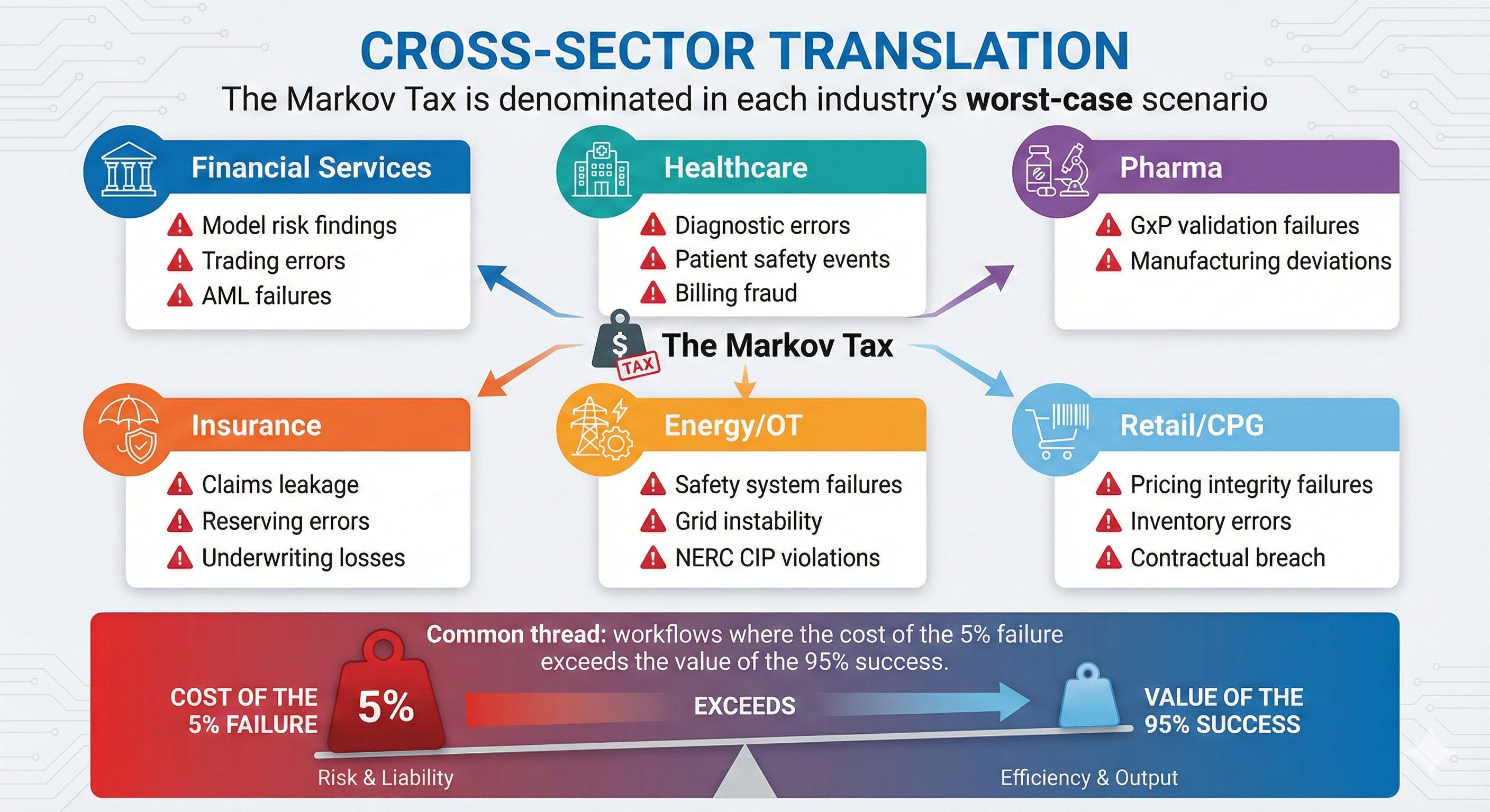 The Constraint: Generation costs deflate aggressively. Verification costs amortize poorly in consequence-bearing domains. This “Markov Tax” inverts expected economics wherever errors have consequences.